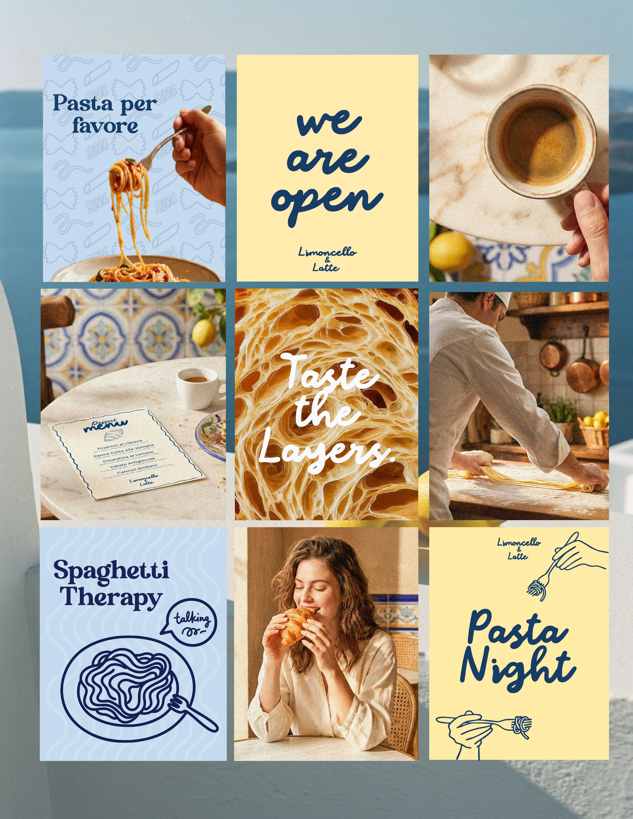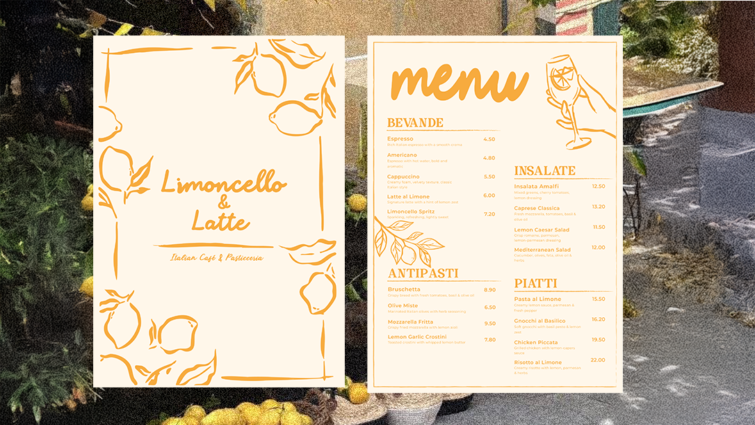 Limoncello Latte is a conceptual café menu and content design inspired by Italian culture, summer mood, and a cozy café atmosphere. The project focuses on clean layouts, warm colors, and elegant typography to create a fresh, light, and inviting visual experience.